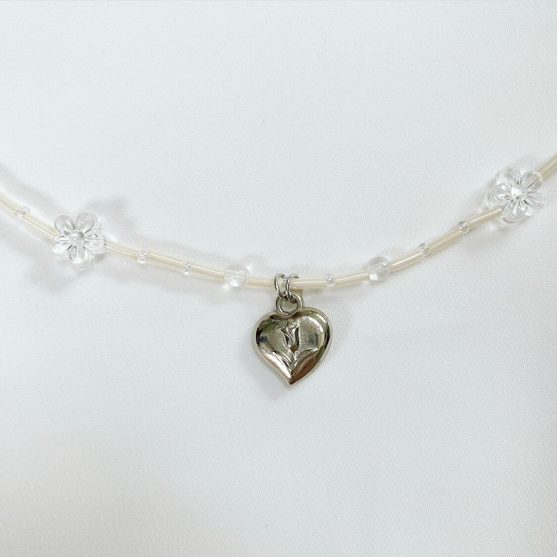 チューリップのハートチャームをビーズネックレスに仕上げました。