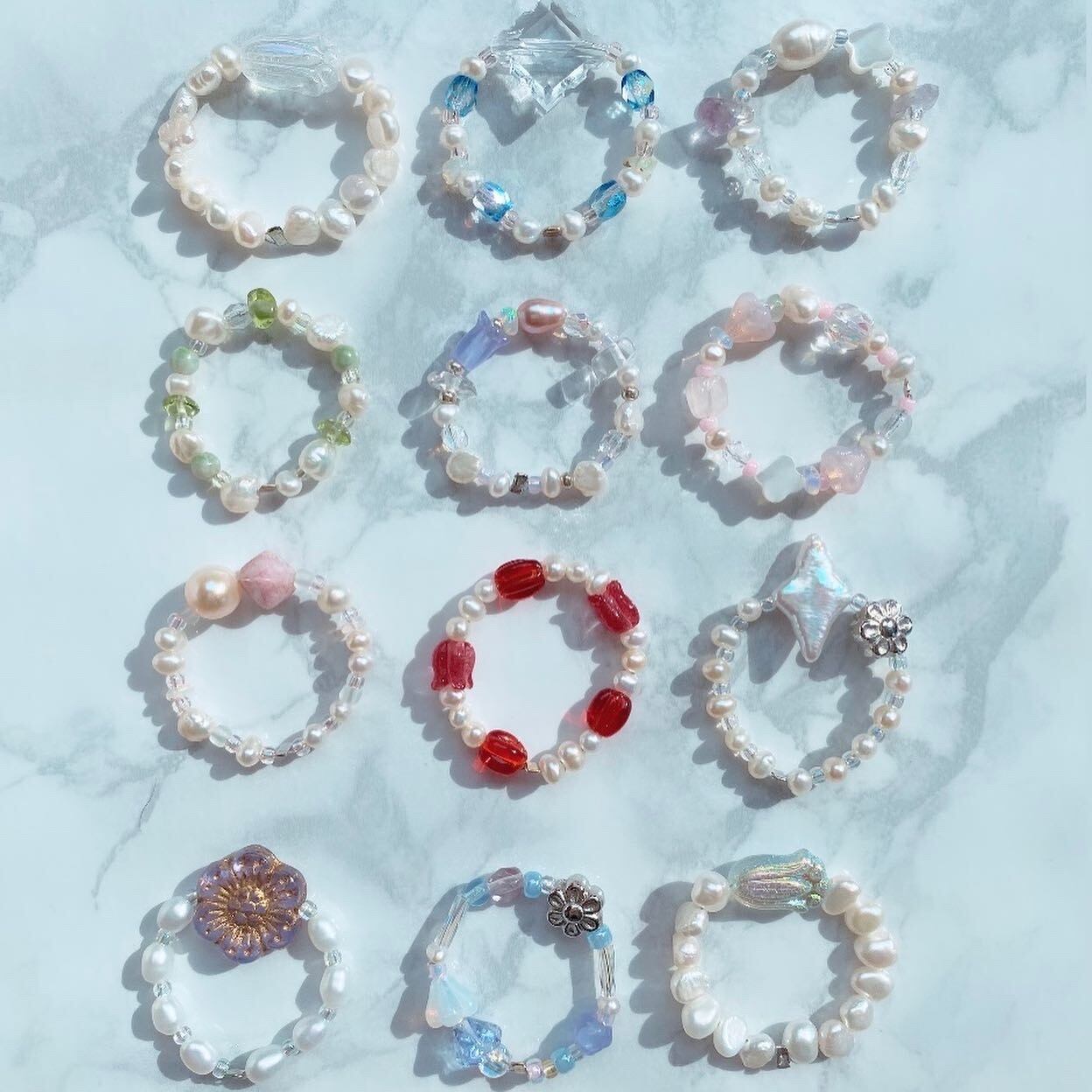 淡水パールにヴィンテージビーズや天然石などを使用し作ったビーズリングです。
